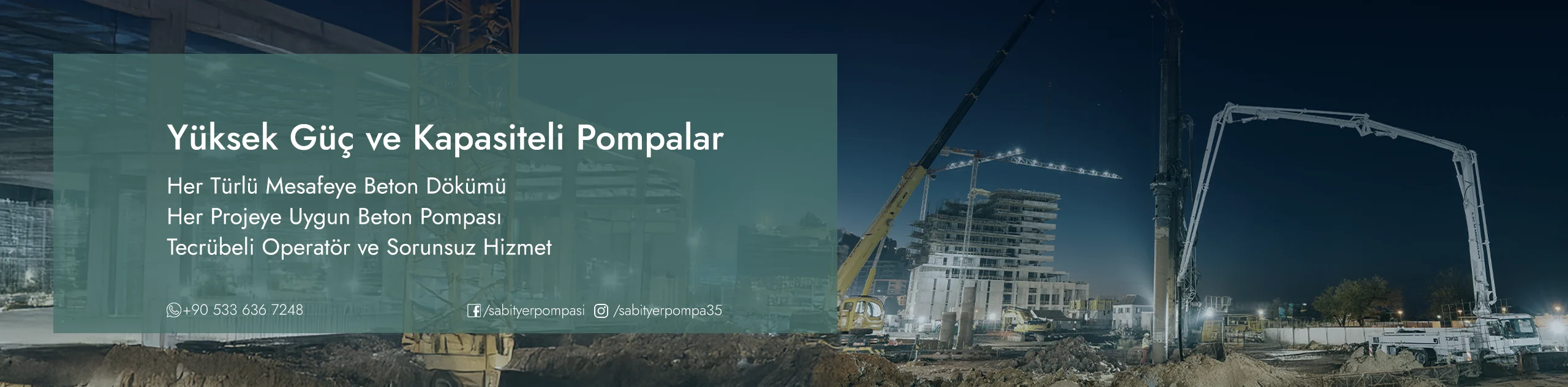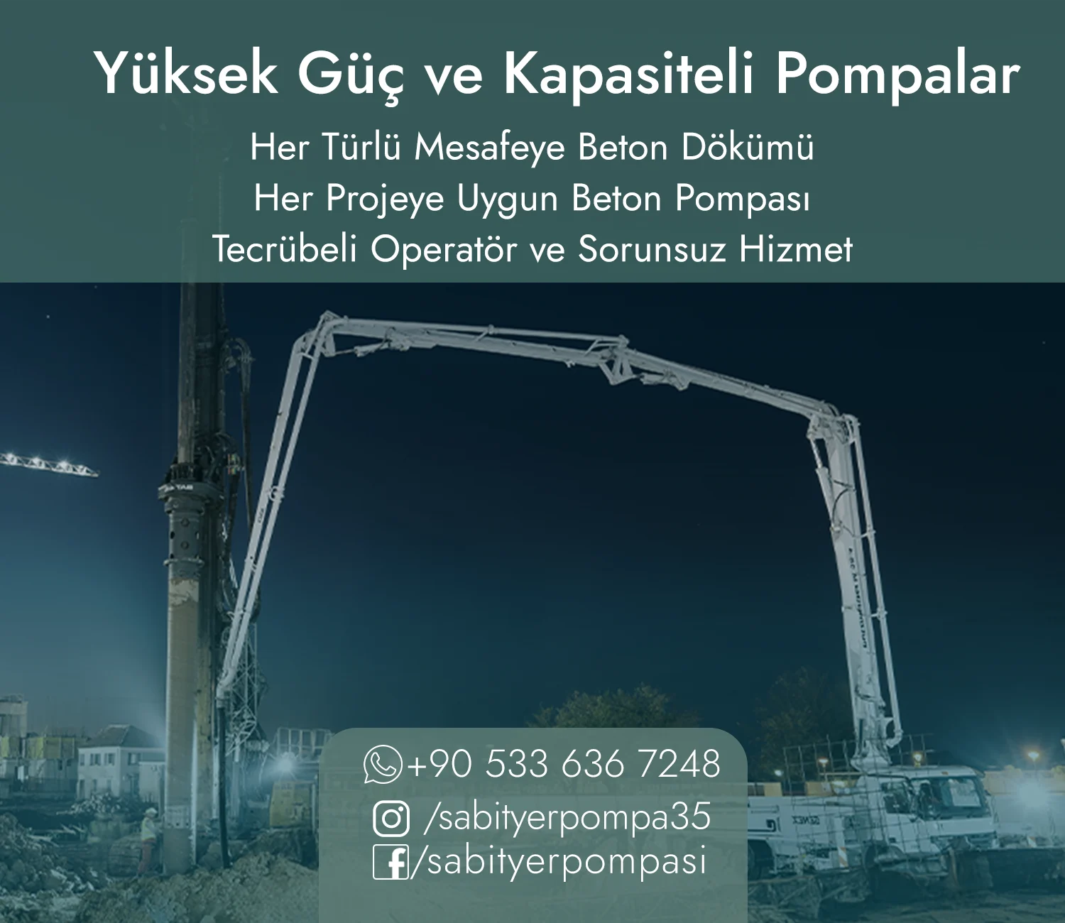 Uzun mesafelere, yüksek katlara veya dar alanlara sorunsuz beton dökümü sağlıyoruz. Tecrübeli operatörlerimiz ve modern ekipmanlarımızla yer pompası ve mobil pompa hizmetlerini güvenli, kesintisiz ve zamanında gerçekleştiriyoruz. İnşaat projelerinde verimlilik ve dayanıklılığı artırmak için profesyonel beton pompası kiralama çözümleri sunuyoruz.